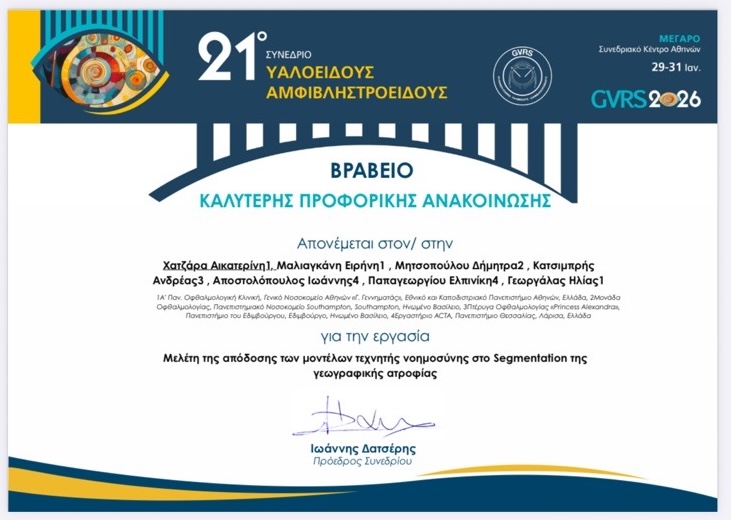 21st Vitreous Retina Conference, 29-31 January, 2026, Athens, Greece Chatzara A., et al., Μελέτη της απόδοσης των μοντέλων τεχνητής νοημοσύνης στο segmentation της γεωγραφικής ατροπίας